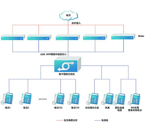 根據(jù)以上要求,公司語音通信系統(tǒng)采用集團(tuán)電話數(shù)字程控交換機(jī)實(shí)現(xiàn)多終端語音通信功能。根據(jù)綜合布線子系統(tǒng),本系統(tǒng)設(shè)計(jì)滿足120個(gè)終端使用,系統(tǒng)接入6部普通外線號碼及4部專用語音外線號碼,通過光纖解調(diào)器統(tǒng)一接入程控交換機(jī)。系統(tǒng)選用擴(kuò)容型插卡結(jié)構(gòu)數(shù)字程控機(jī),配置為8外線104分機(jī),交換機(jī)所有模塊均采用插卡結(jié)構(gòu),在維護(hù)、升級機(jī)器中,分機(jī)卡與外線卡通用(8外線一個(gè)卡/8分機(jī)一個(gè)卡),擴(kuò)容方便,節(jié)約成本,系統(tǒng)可擴(kuò)容至16外線128分機(jī),滿足擴(kuò)展性的要求。