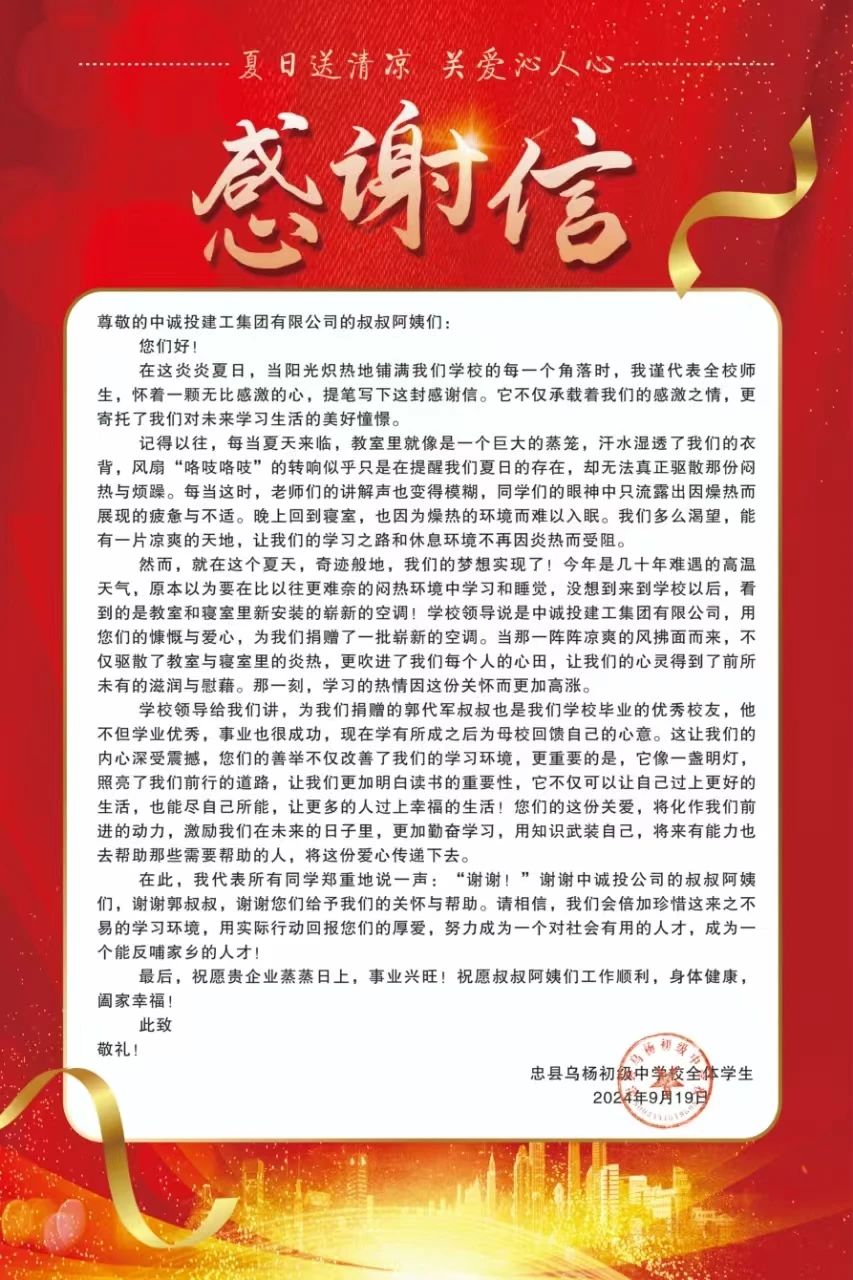 9月19日,中誠投建工集團收到一封來自重慶市忠縣烏楊初級中學全體師生的感謝信。信中對集團公司及董事長郭代軍慷慨解囊為學校捐贈空