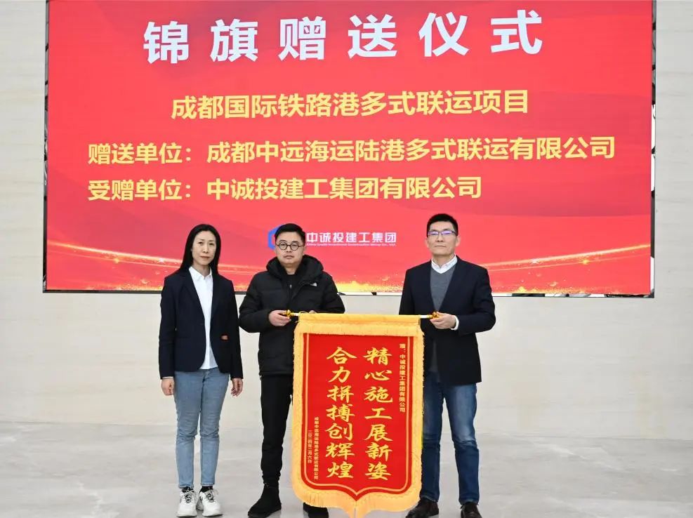 1月17日,中誠投建工集團收到成都中遠海運陸港多式聯運有限公司業主代表王麟送來印有精心施工展新姿 合力拼搏創輝煌的一面錦旗,