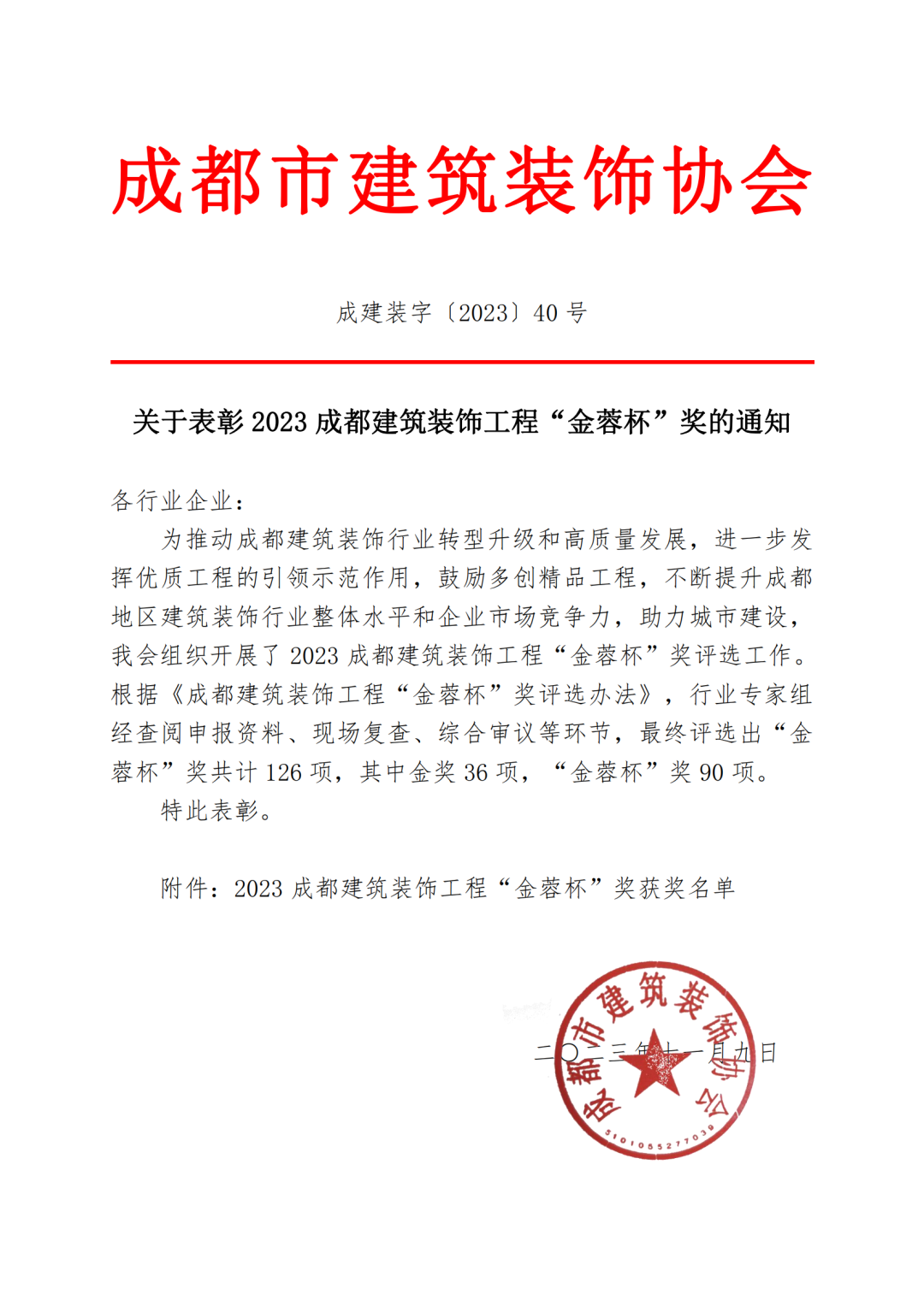 集團公司項目榮獲2023成都建筑裝飾工程“金蓉杯”獎