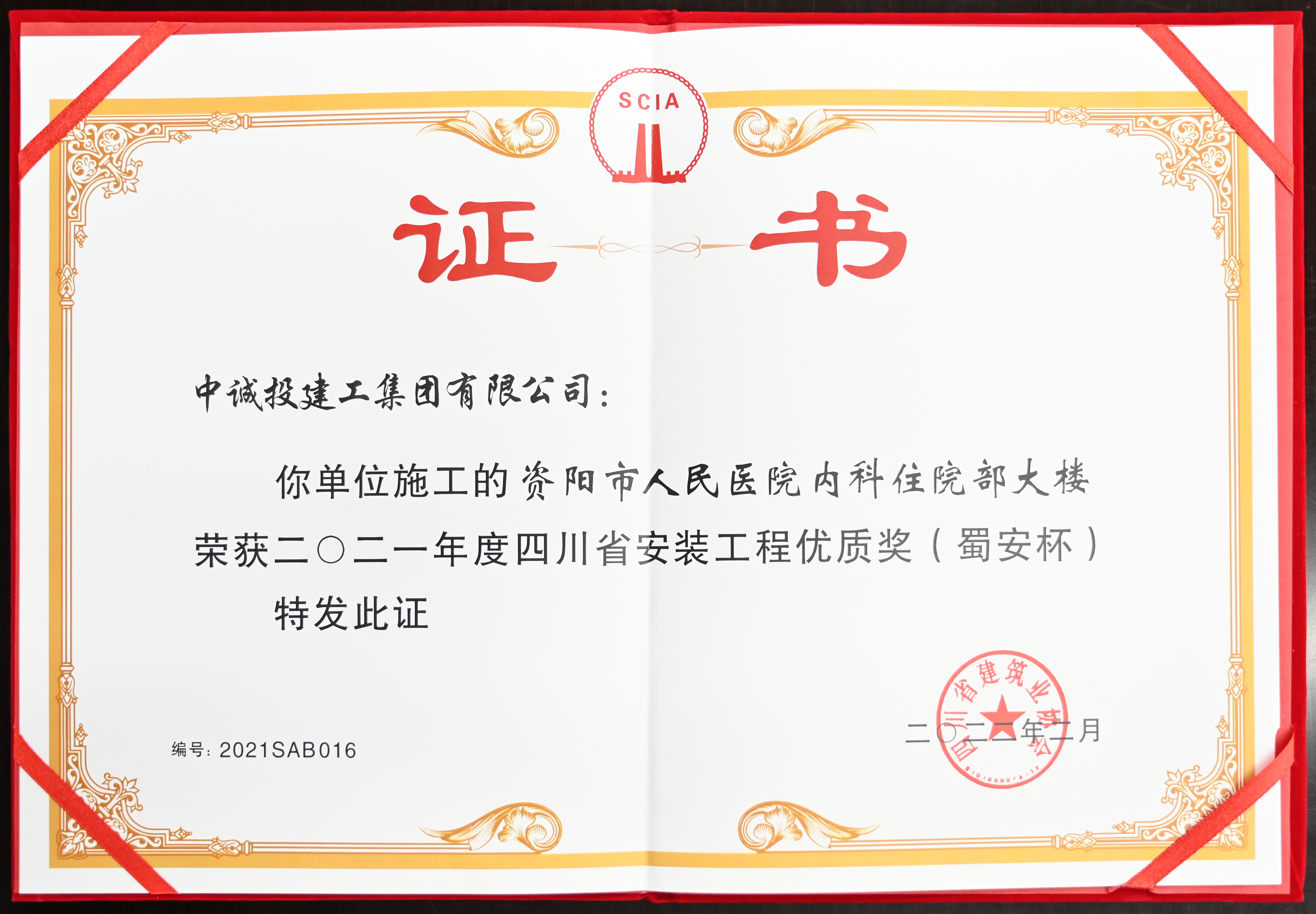 近日,四川省建筑業協會公布了2021年度四川省安裝工程優質獎(蜀安杯)工程名單,由中誠投建工集團承建的資陽市人民醫院內