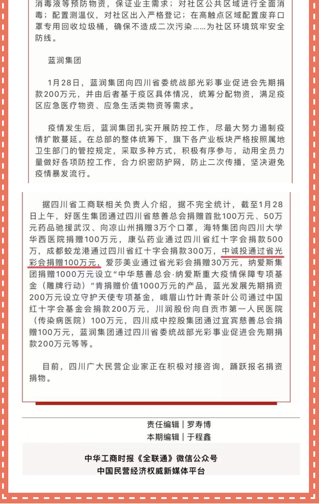 紅星新聞、中華工商時報全聯通、騰訊新聞等多家媒體,均特別報道了集團公司向武漢捐款的消息,高度贊譽中誠投的擔當與善舉,同時,也得到了行業同仁及社會各界的大嘉贊賞。