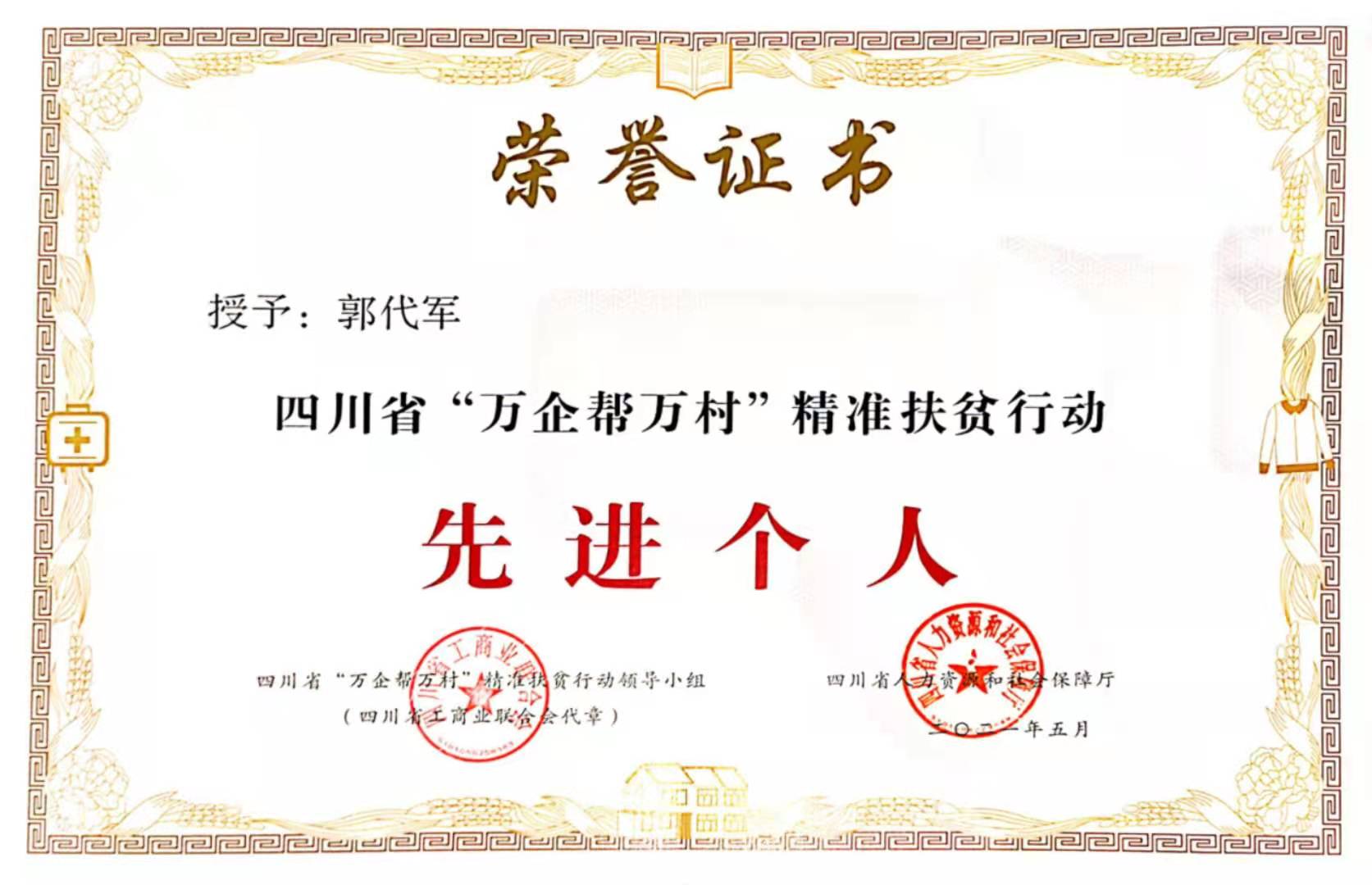 中誠投建工集團(tuán)有限公司董事長郭代軍榮獲“四川省‘萬企幫萬村’精準(zhǔn)扶貧行動先進(jìn)個人”稱號。