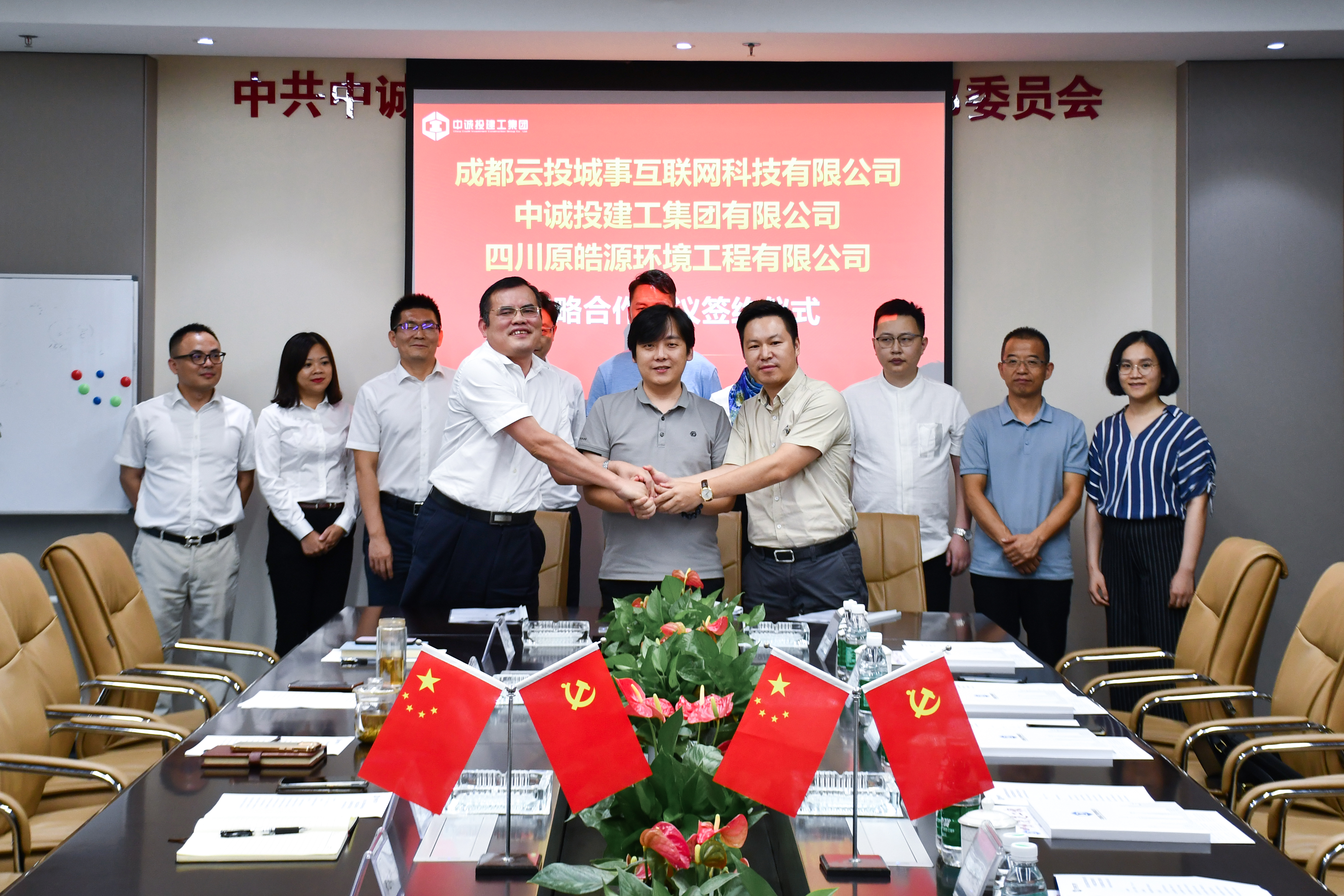 8月17日下午,中誠投建工集團有限公司(以下簡稱“中誠投”)與成都云投城事互聯網科技有限公司(以下簡稱“云投城事科技”)、四川原皓源環境工程有限公司(以下簡稱“四川原皓源”)簽署戰略合作協議。中誠投執行董事長蔣仁紅同云投城事科技董事長萬奇,四川原皓源董事長楊琦代表三方簽約。