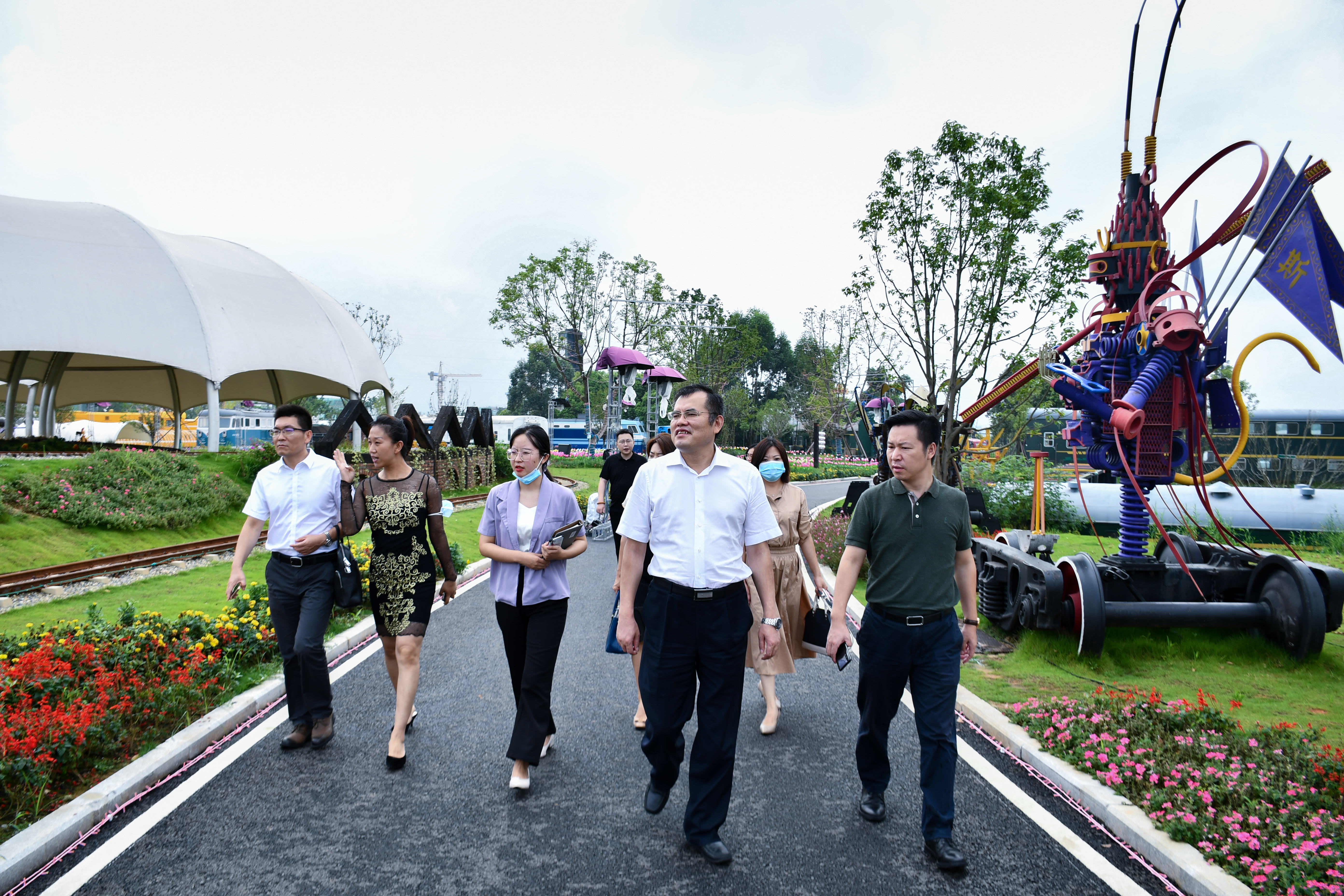 考察期間,蔣仁紅一行在CQCC執(zhí)行總裁李木子、四川原皓源環(huán)境工程有限公司董事長楊琦及中鐵四川生態(tài)城投資有限公司副總經(jīng)理覃列宇的陪同下,先后參觀了雙龍藝術小鎮(zhèn)、火車來斯主題樂園、中鐵文化交流中心等,詳細了解了項目前期策劃、運營管理模式、基礎設施配套及項目實施進度情況,并在隨后的座談中圍繞擬投資和合作項目展開了深入交流。