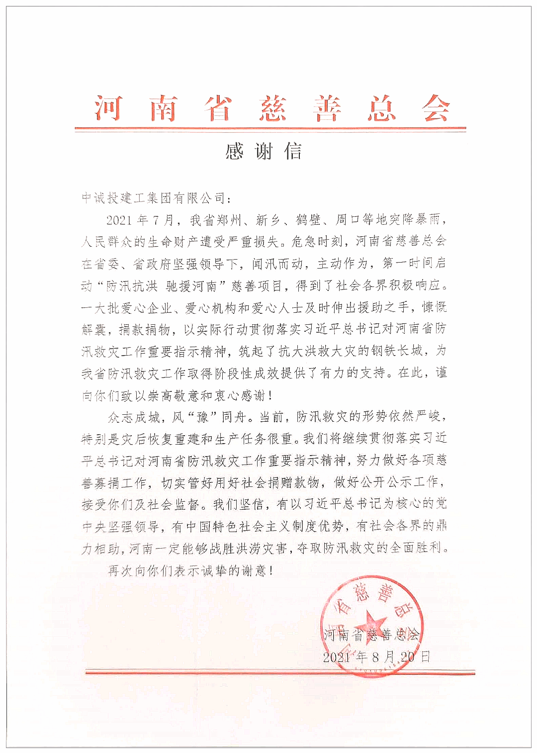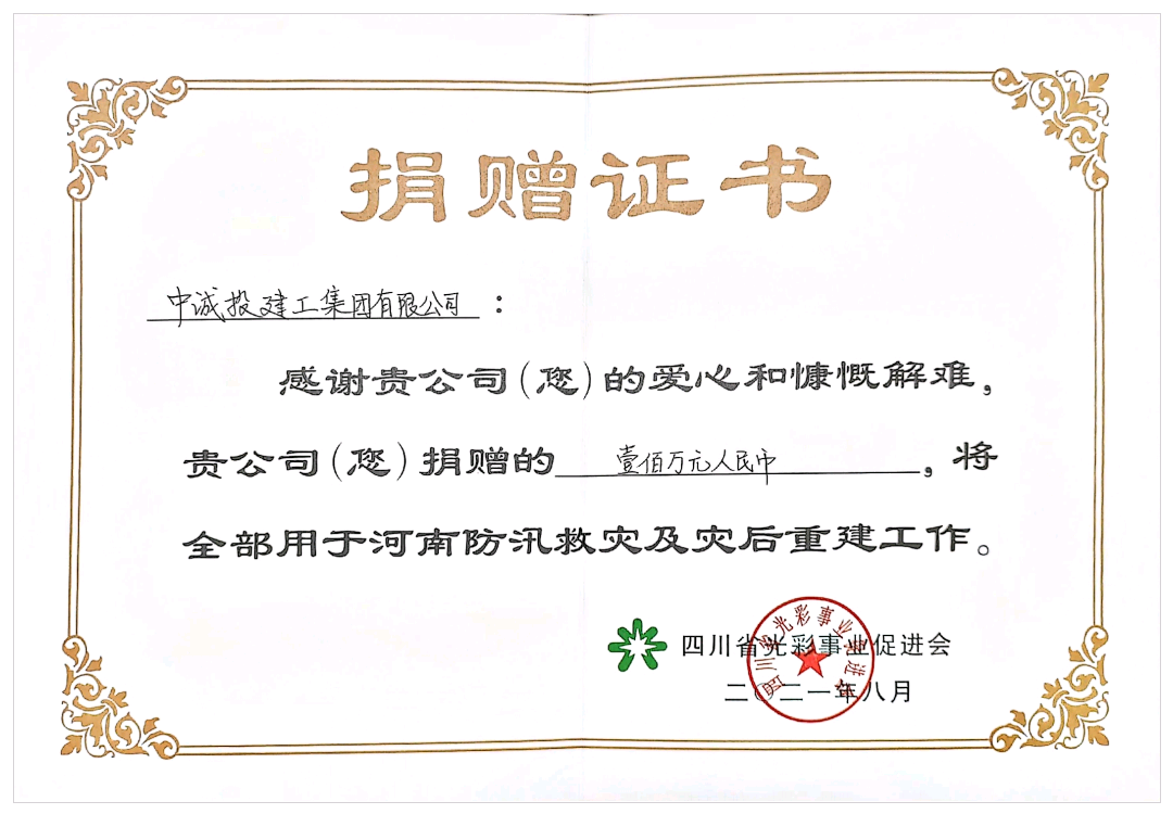 近日,河南慈善總會給中誠投建工集團發來捐贈證書及感謝信,對中誠投在“防汛抗洪,馳援河南”行動中,積極響應,慷慨解囊,捐款捐物,致以崇高敬意和衷心感謝。