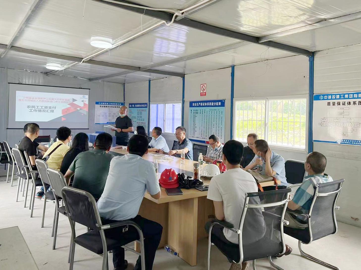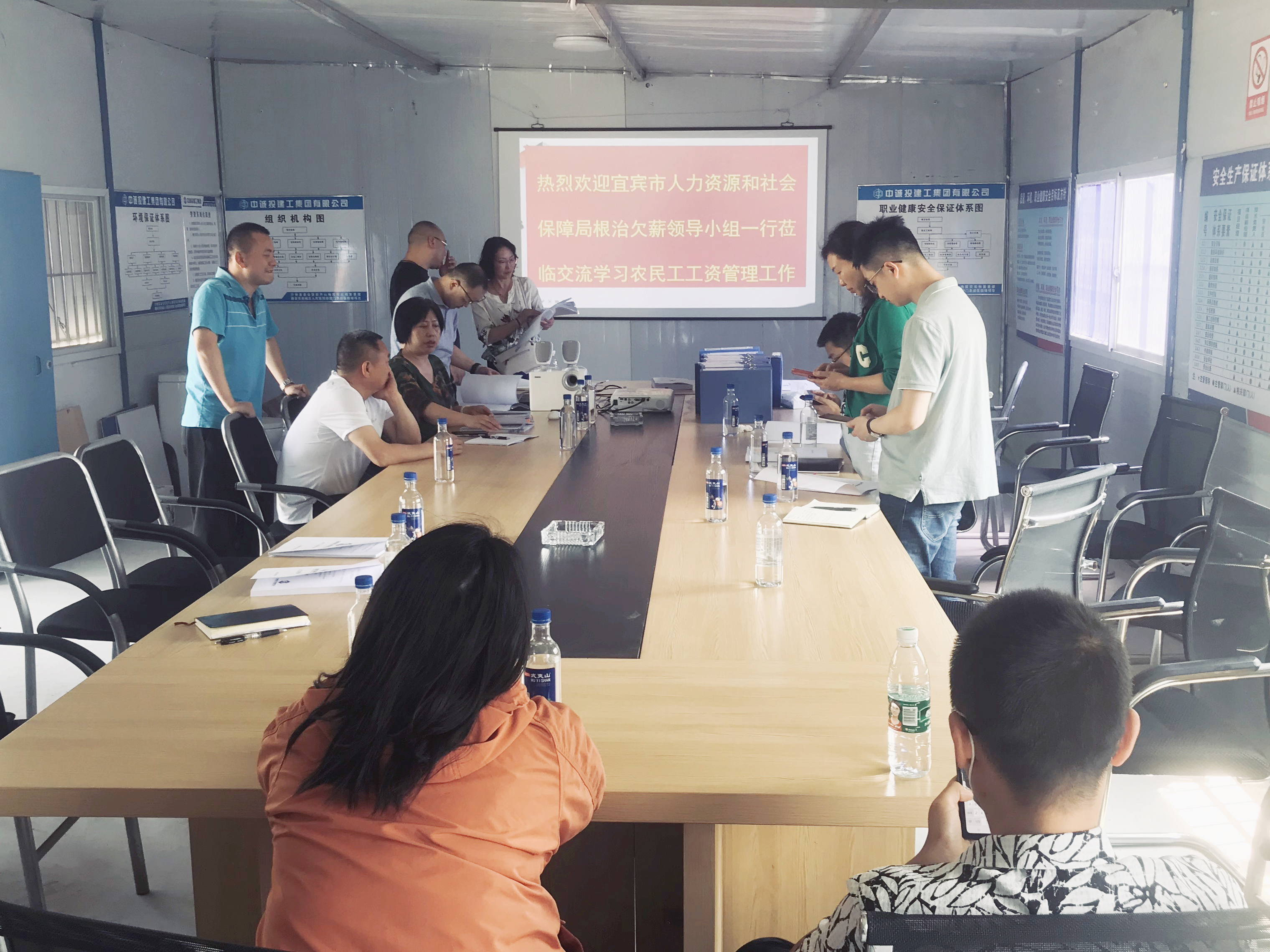 考察交流會(huì)上,項(xiàng)目部負(fù)責(zé)人向領(lǐng)導(dǎo)小組介紹了雨城區(qū)人民醫(yī)院門(mén)急診醫(yī)技樓項(xiàng)目的基本情況,并圍繞《保障農(nóng)民工工資支付條例》八項(xiàng)制度相關(guān)要求,從項(xiàng)目工資保證金、工資分賬管理、勞務(wù)實(shí)名制建設(shè)、過(guò)程資料管理、農(nóng)民工工資支付管控、宣傳教育、亮點(diǎn)做法等方面,與參會(huì)人員進(jìn)行了詳細(xì)講解和深入交流。領(lǐng)導(dǎo)小組充分肯定了該項(xiàng)目保障農(nóng)民工工資支付工作取得的實(shí)效,并紛紛表示當(dāng)?shù)馗髟诮?xiàng)目要向該項(xiàng)目學(xué)習(xí),把農(nóng)民工工資支付工作落到實(shí)處,切實(shí)維護(hù)好農(nóng)民工的合法權(quán)益。