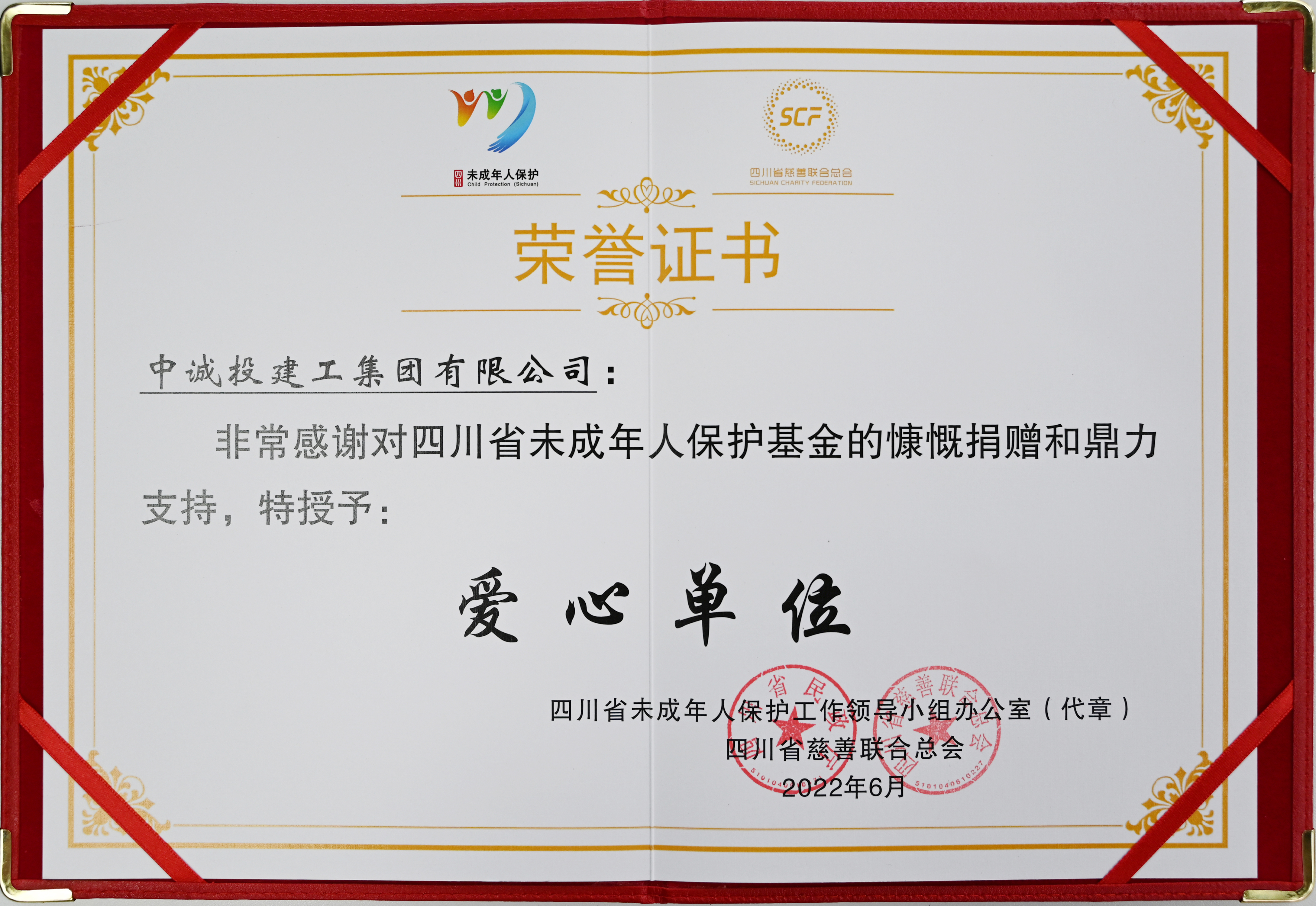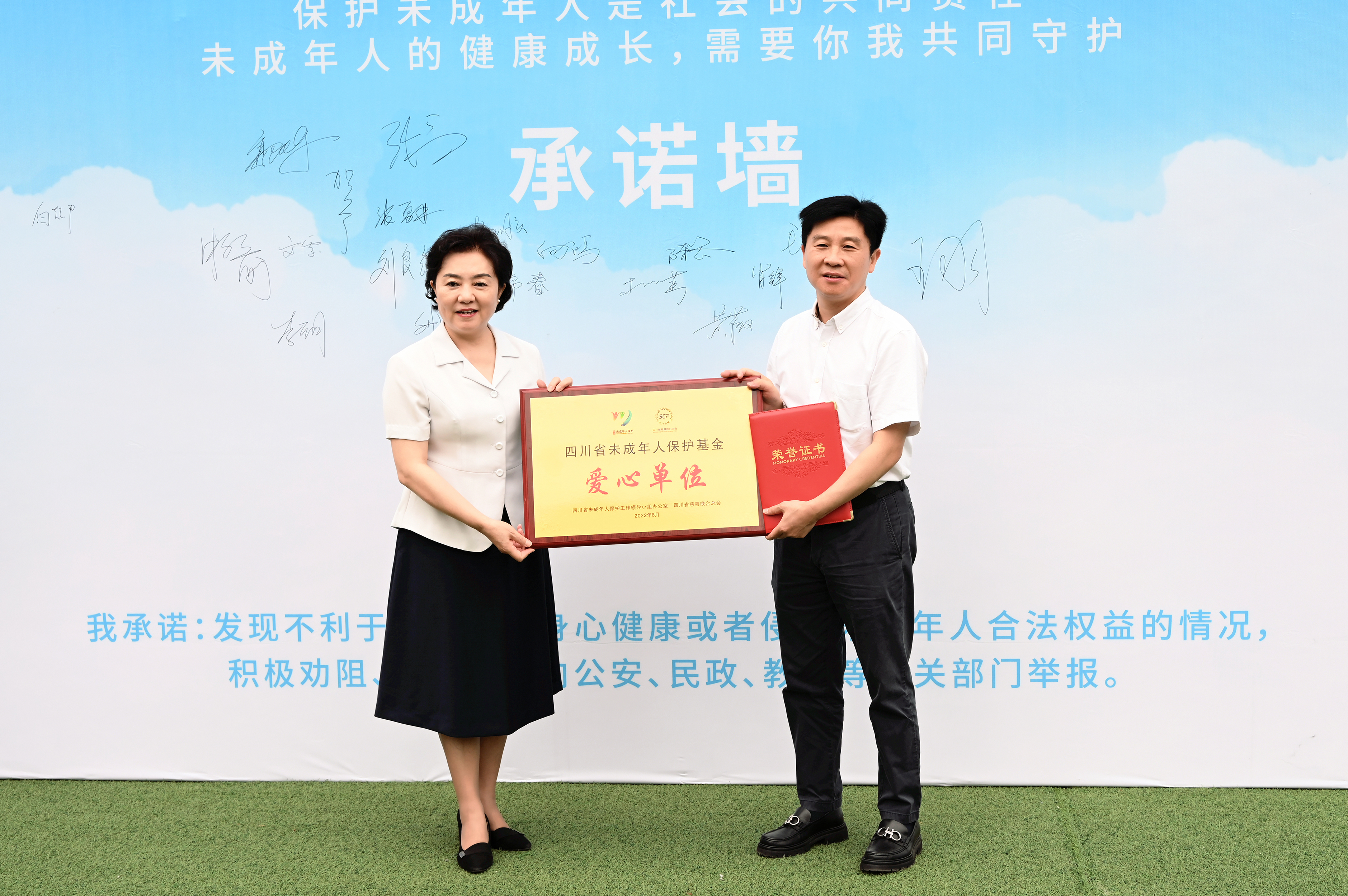 儀式前,民政廳副廳長、省未成年人保護工作領導小組辦公室副主任鄧為向郭董事長頒發“四川省未成年人保護基金愛心單位”榮譽證書及獎牌。