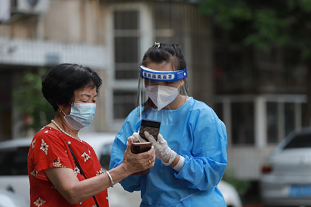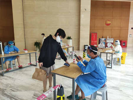 員工付英在居住小區(qū)擔(dān)任志愿者,協(xié)助核酸檢測點發(fā)放檢測物資,幫助居民掃碼錄入信息。
