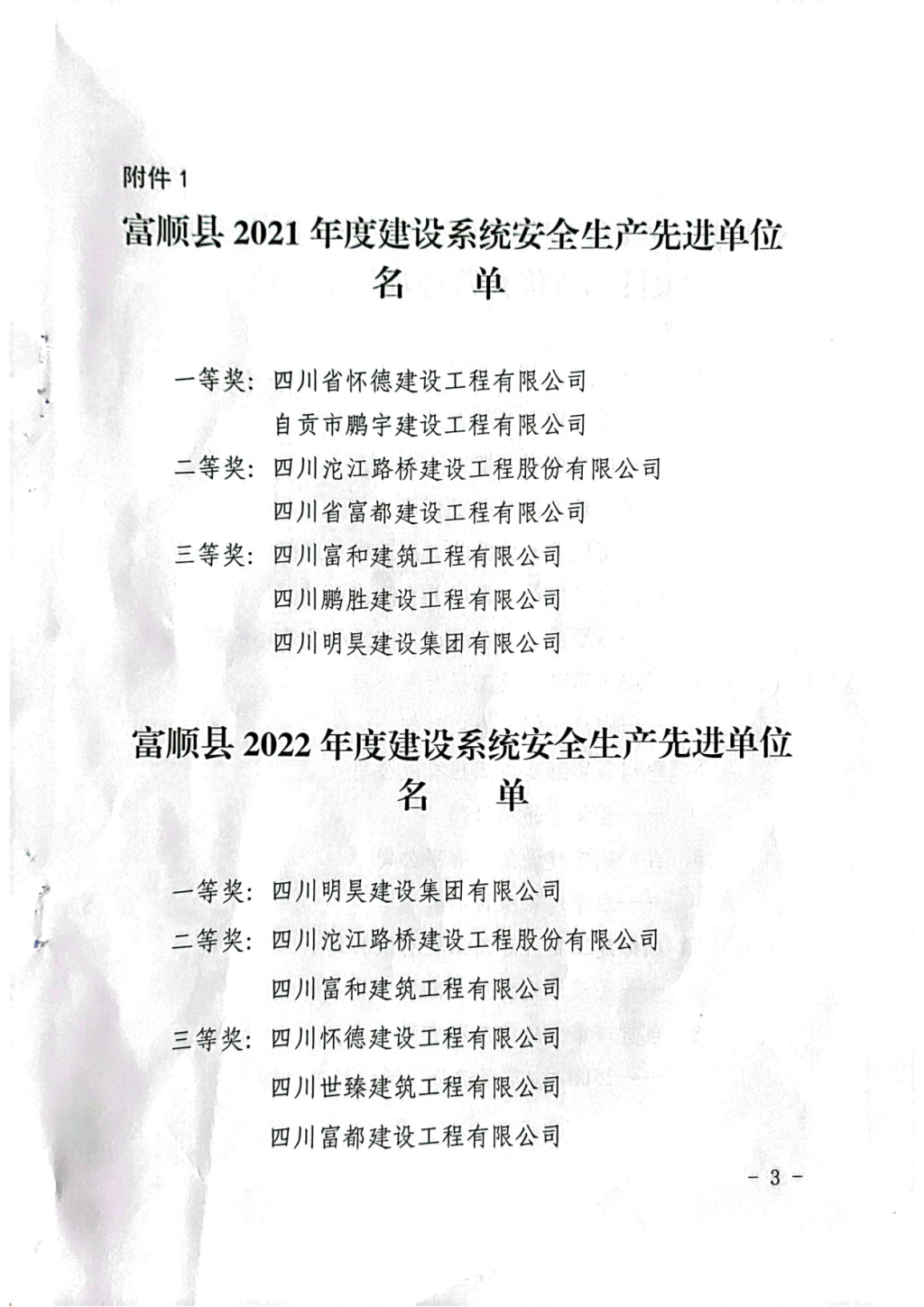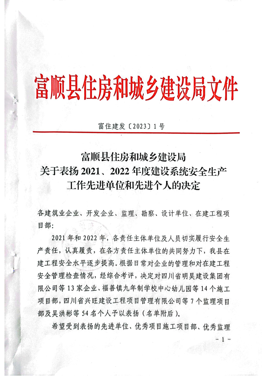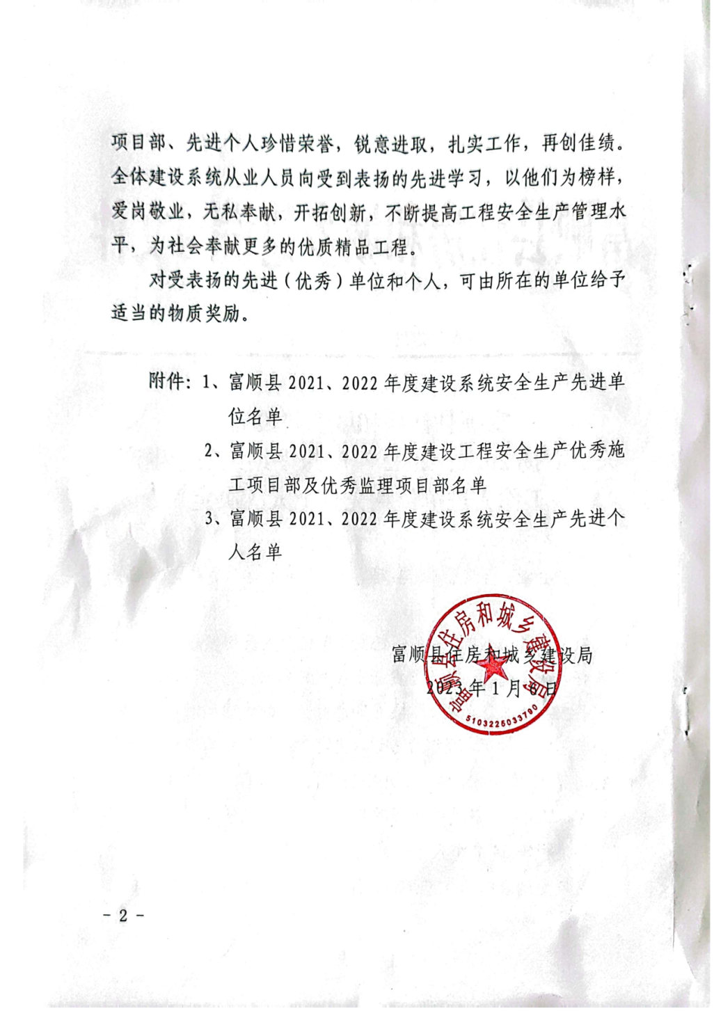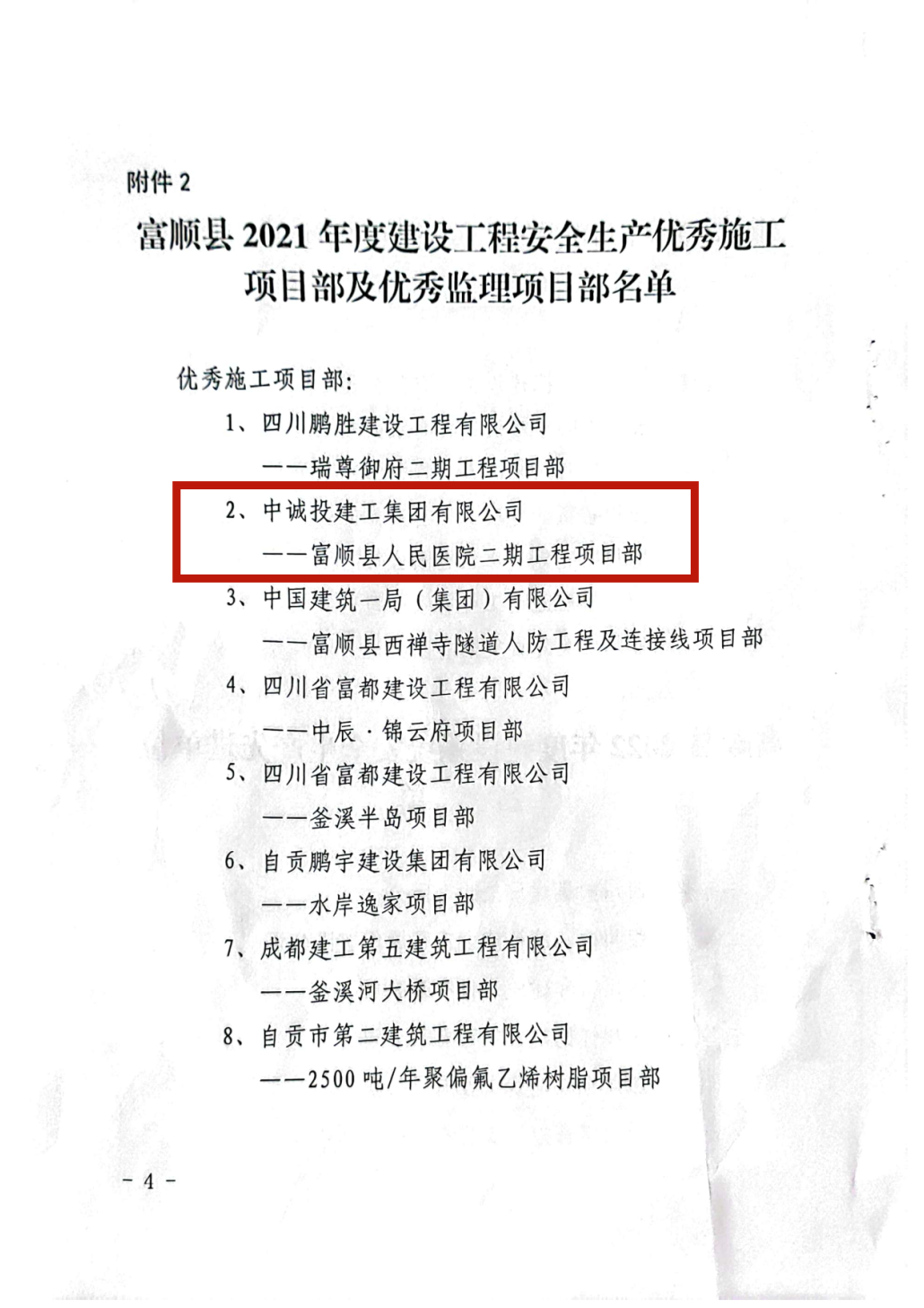 近期,富順縣住房和城鄉建設局發布了《關于表揚2021、2022年度建設系統安全生產工作先進單位和先進個人的決定》,由集團公司承建的富順縣人民醫院二期工程獲評2021年度“優秀施工項目部”。