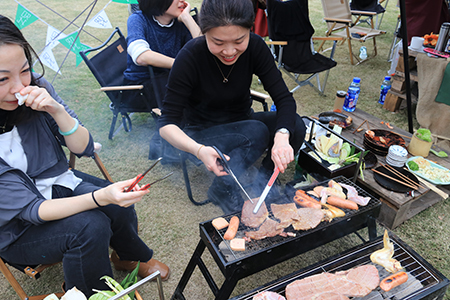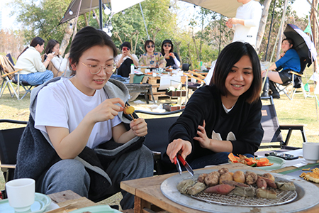傍晚時分,女職工們圍坐在烤爐旁,個個變身為“大廚”,翻動著烤肉,揮灑著調料,分工協作,氣氛其樂融融。煙熏炙烤出的濃郁香氣瞬間勾起食欲,蘸滿佐料的烤肉誘人胃口大開,大家盡情享受著美食帶來的快樂。