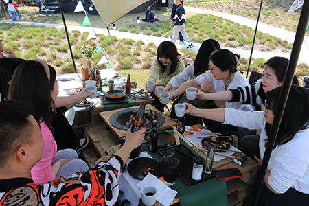 當天下午,在集團公司工會的組織下,集團公司領導以及工會全體女職工一同來到成都麓湖郊野。在營地綠茵中,一頂頂白色天幕,一張張木質小桌,一把把月亮椅,讓女職工們感受到了春天的氣息。大家三三兩兩地坐在一起,迎著春風,曬著暖陽,圍爐煮茶,聊著生活和工作中的趣事,享受著鄉野的美景,歡聲笑語環繞耳邊。