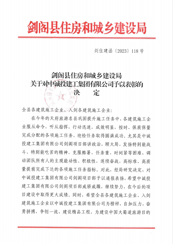 優(yōu)質(zhì)履約贏贊譽(yù)|中誠(chéng)投建工集團(tuán)獲劍閣縣住建局通報(bào)表?yè)P(yáng)