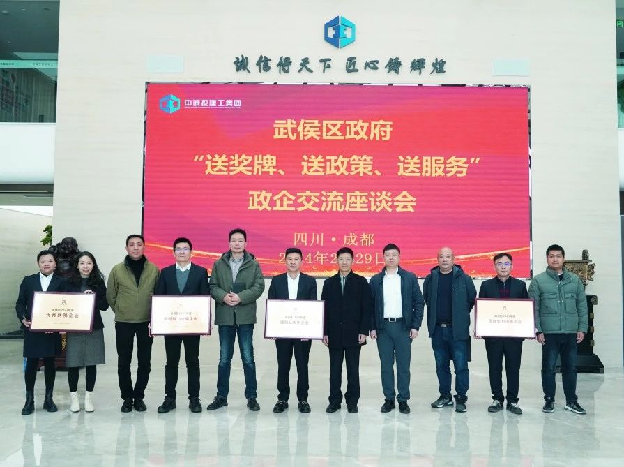 會后,調(diào)研組領(lǐng)導(dǎo)分別為中誠投頒發(fā)了武侯區(qū)2023年度“建筑業(yè)優(yōu)勢企業(yè)”“創(chuàng)新型100強企業(yè)”“貢獻型100強企業(yè)”“優(yōu)秀納稅企業(yè)”四項榮譽獎牌。