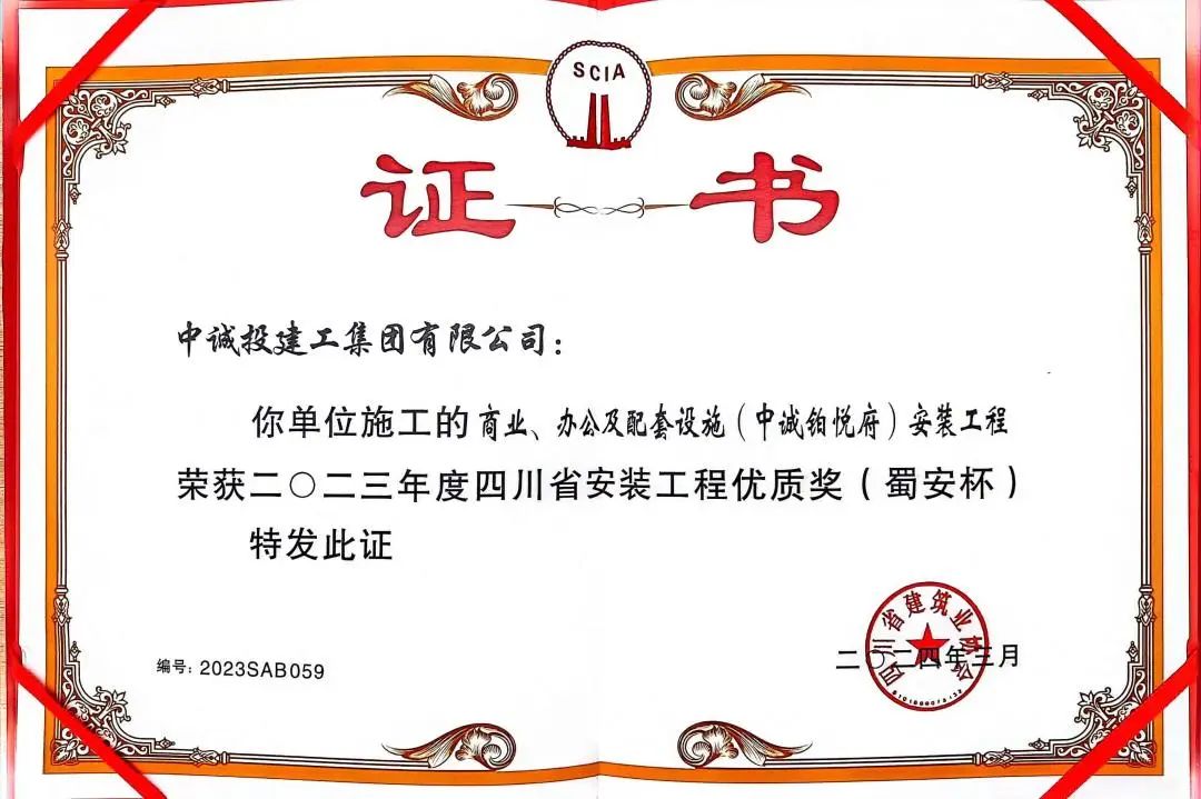 中誠·鉑悅府項目榮獲2023年度四川省安裝工程優質獎